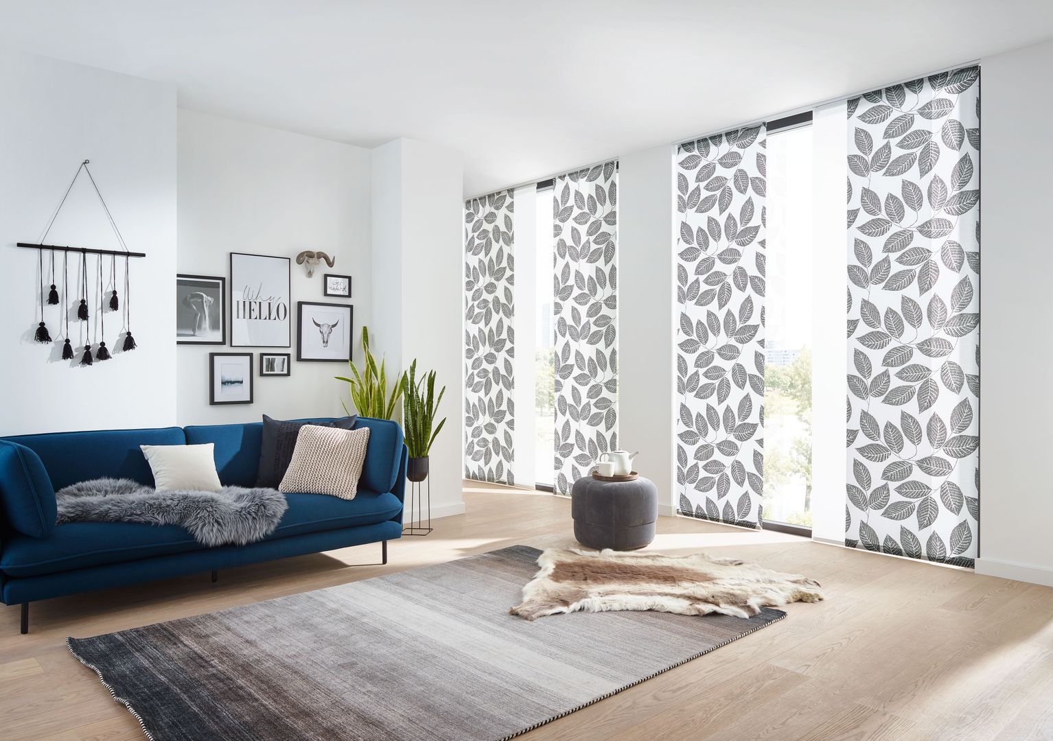 Die Paneele sind in individuellen Größen und praktisch unendlich vielen verschiedenen Stoffdesigns erhältlich. Die Paneele lassen sich einfach abnehmen und austauschen (Befestigung mittels Klettband). Die Montage der Schiebevorhänge erfolgt wahlweise an Wand oder Decke. Besonders für große Fenster, Glasfronten oder als Raumteiler bestechen Flächenvorhänge mit ihrer modernen, reduzierten Formensprache.